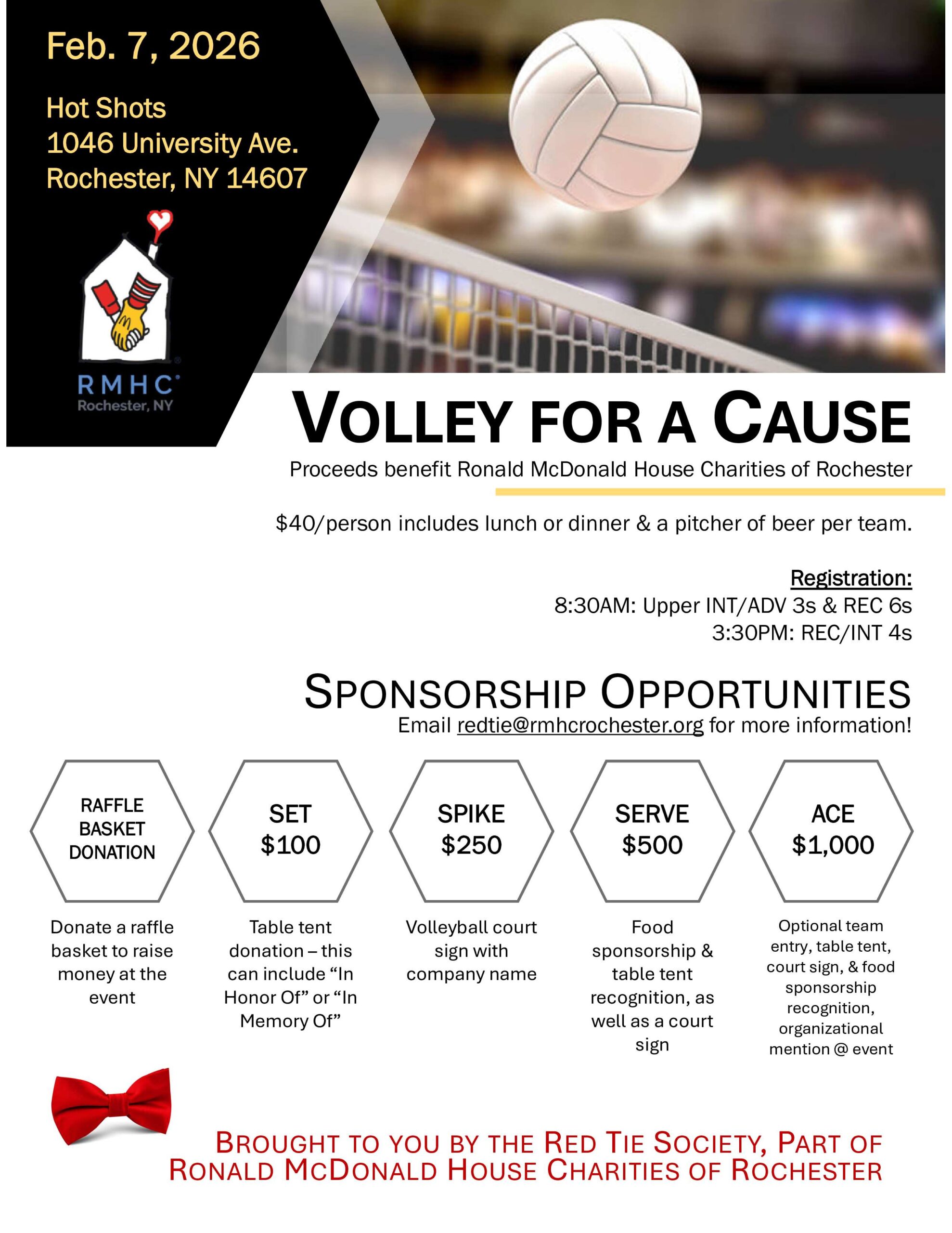Experience the energy and camaraderie of Volley for a Cause as we come together for a day of friendly competition, great food, and meaningful impact. It’s a celebration of community, teamwork, and heart—all in support of the families who rely on RMHC Rochester.
